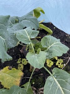 Jetzt ist der Blumenkohl unter einer Haube von Fliess versteckt. Aber es geht ihm gut und er wächst allmählich. Die Margeriten leuchten noch gelb, der erste Frost hat ihnen nicht zugesetzt.