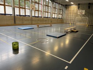 Herbstlauf = Staffette mit Purzelbaum auf Schreglage, hüpfen, balancieren, gesammelte Herbstblätter an der Seite des T-shirts festmachen, durch den Reifen steigen, einen Purzelbaum auf der Matte machen, über die (schrege) Bank balancieren, Klammer durch einen Reifen werfen, platzieren, zurück springen, Handschlag