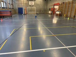 Heute spielen wir Tennis mit einem Ballon und probieren über den grossen Mattenwagen ein Säcklein zu werfen, welches auf der anderen Seite wieder gefangen werden kann. Wenn der Wurfgegenstand wieder zurück kommt, so heisst dieses Spiel: Rückschlagspiel. Auch die Reaktion möchten wir heute trainieren.