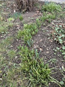Wer jetzt durch meinen Garten spatziert, der kann sich an den vielen Tulpen, die sich durch die kalte Erde drücken, erfreuen. Auch viele Narzissen machen sich an die frische Luft. Die Krokusse strecken ihre ganze Blüte an die Sonne. Sogar die Hyazinthen zeigen sich. Ihre Köpfe schauen bereits zwischen dem Grün hervor. Kleine Spitzen der Pfingstrosen sind zu erkennen. Die Lilien haben eine Blatthöhe von ca. 10 Centimenter erreicht.